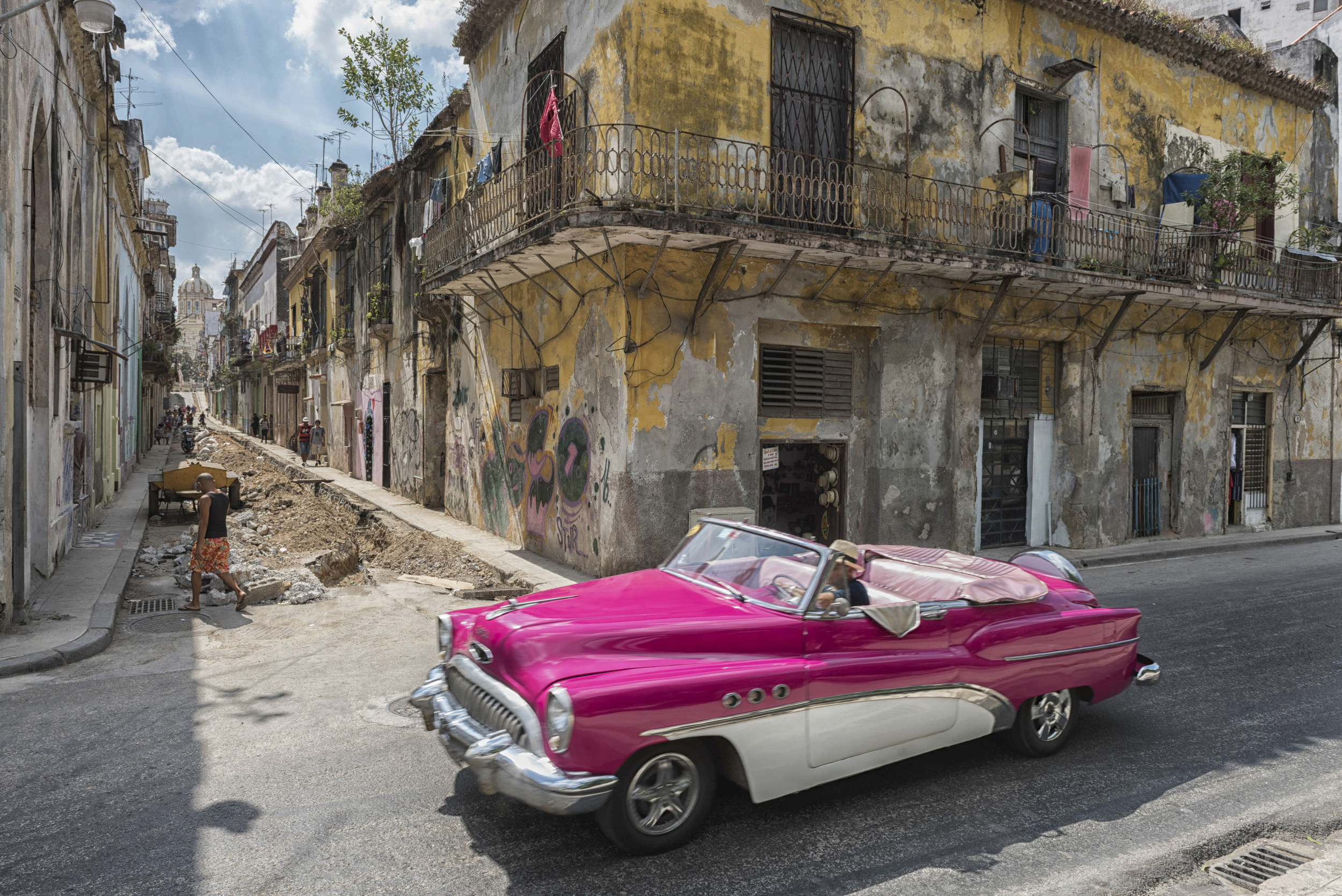 The next picture shows a colourful vintage car against the backdrop of the old town's houses. The two elements complement each other perfectly.