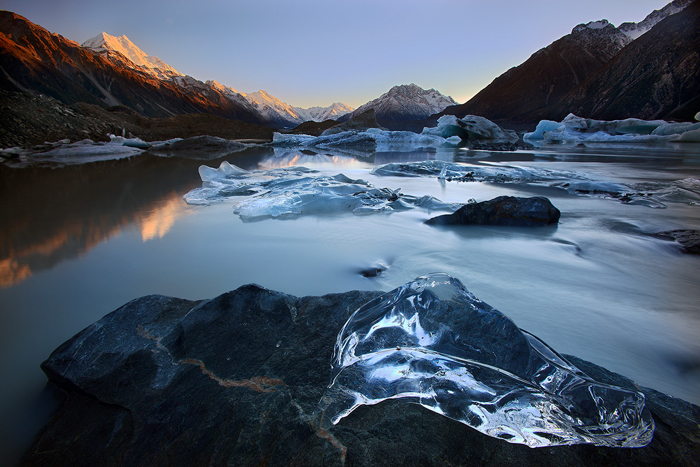 Thanks Yan, I have to confess that at the moment I captured this image, I never envisaged that it would eventually become one of my personal favourites. The title of the photo is called “Desperate Measures” because the behind the scenes situation was really quite frantic. I had carefully set up my composition with this iceberg. As usual I was standing in the ice cold water (this time I stripped down to underwear and sandals since nobody was around) ready to shoot the sunset. Then, at the crucial moment the piece of ice suddenly started to spin and float down the river. I desperately lunged to save it and using my tripod managed to haul it back towards the shore. In fact the sunset was nothing to write home about but the dull conditions forced me to think differently about how I could best make use of the light. The subtle reflection of the cloud on the piece of ice and the surrounding water was the key to making the photo work. In monochrome, I was able to emphasize the glow in a more natural way than it would have been possible in colour. In the end concentrating on creating a dark and ominous mood helped to make this a distinctive Mount Cook shot since almost everyone else focuses on sweet light, colour and reflections. In the past couple of years, I have expanded my repertoire to include more brooding imagery.