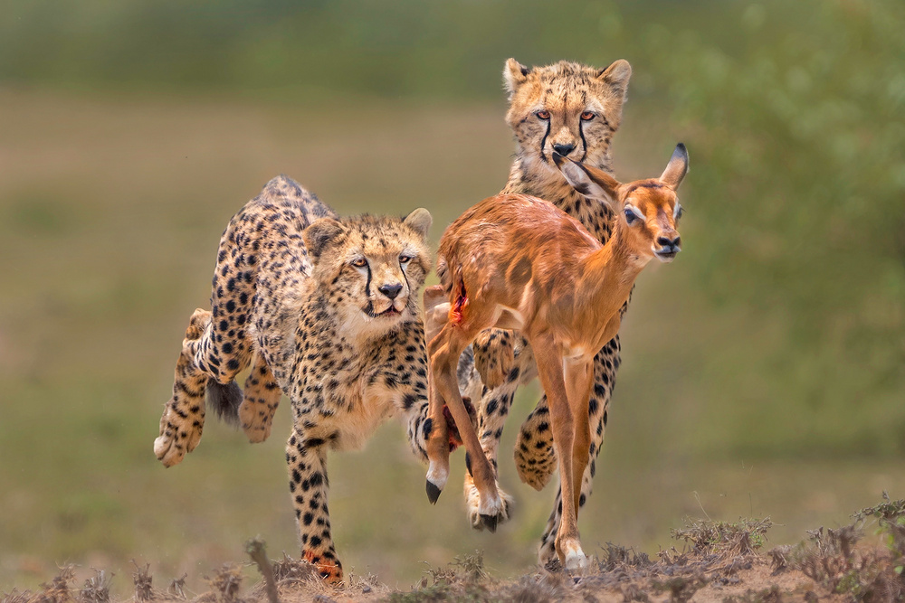 The action is frozen, but the photo is not a static one. It is full of drama. Look at the eyes of the cheetahs and those of the impala. The fierce concentration in the eyes of the jumping cheetahs, the existential fear, the panic in the impala's expression. Except for being taken at the right moment, it's the eyes that make this photo so strong.