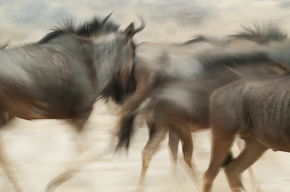 It is an almost abstract photo and yet showing us the characteristic features of wildebeests. But there is more to it. It is a very suggestive image. The composition makes you feel as being part of the running herd, that is being moved forward by the dominant wildebeest to the left. And while none of the wildebessts is shown in its total, you get the impression that large numbers are passing by at high speed, suggested by the motion blur. A clever piece of work!