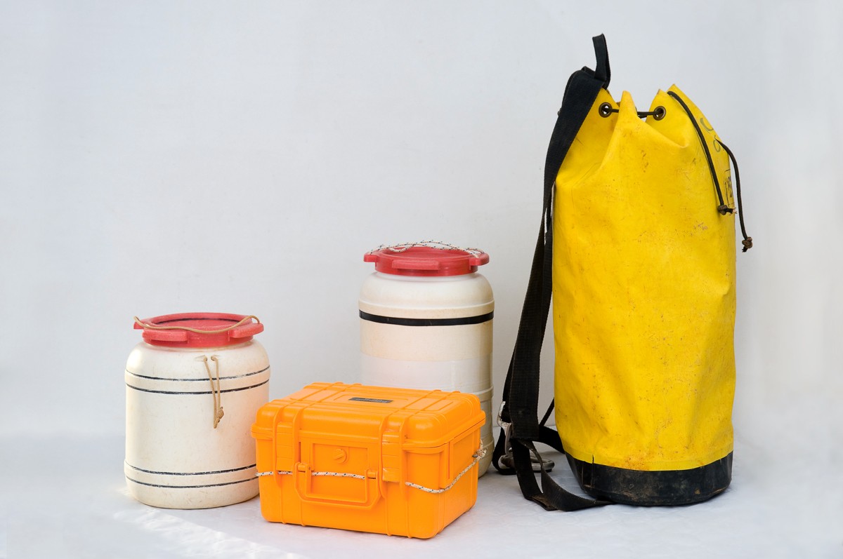 By nature the underground world is humid, muddy and full of narrow passages, some even vertical, which makes it difficult to transport fragile material. For transport, speleologists use the so-called “kit bags”, supple round or oval bags. These bags can be carried on the back like a backpack and they have a thin cord to attach it to the legs when going down a shaft. When going through narrow passages the bags can be put on the ground and pulled with the cord.