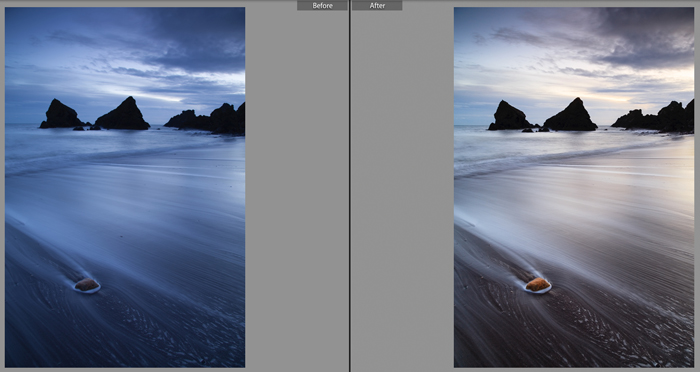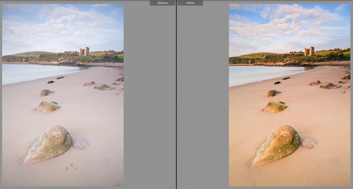 The file on the right was the result of some minor processing tweaks including lens correction, global highlights, exposure and contrast adjustments as well as an increase the vibrancy and selective sharpening (masking) being applied. You will notice that I cloned out some unwanted imprints on the sand in the immediate foreground, which were caused accidentally by me when I placed my tripod legs in the wrong place!