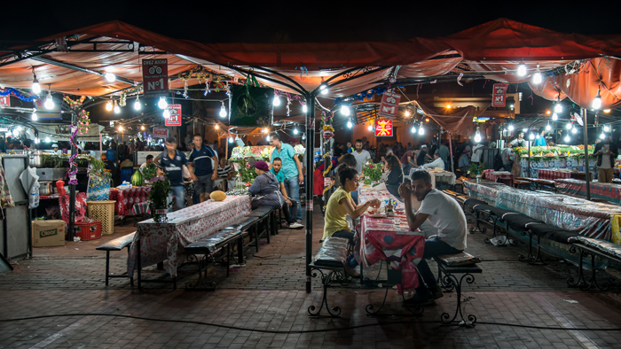 Down on the ground and within the square itself, numerous street artists perform but at the first sign of a raised camera, payment will be requested. Such tourist shots are not in any case the targets of 1x photographers but quick technique can produce some good street photography and after dusk, the brightly illuminated fruit and vegetable stalls and street food vendors become a little easier to capture. Be warned though, locals are eagle-eyed and you’re unlikely to escape any photographic expedition without a heckling or two. Be calm and polite and walk on.