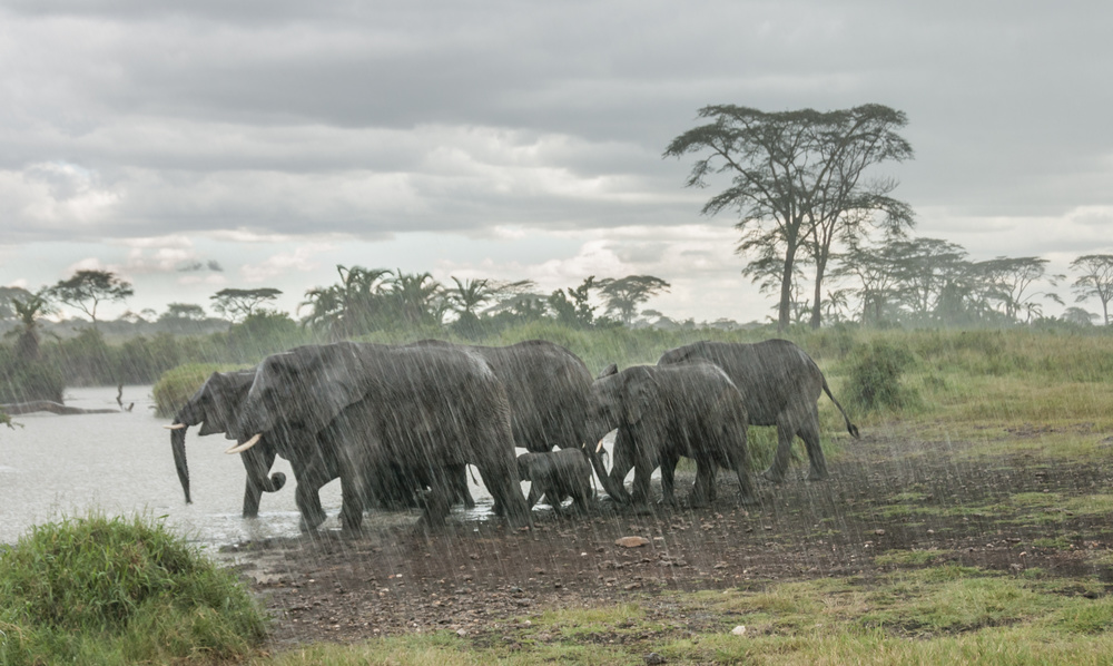 The second image is of a herd of elephants running for cover in a sudden downpour. I just got one shot. But the mood created by dark stormy clouds,pelting rain and the herd running with the baby in between is very dear to me.