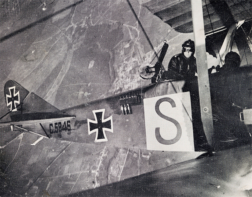 Crewman of a German, World War 1 aircraft takes a picture with a camera attached to a wing-strut.