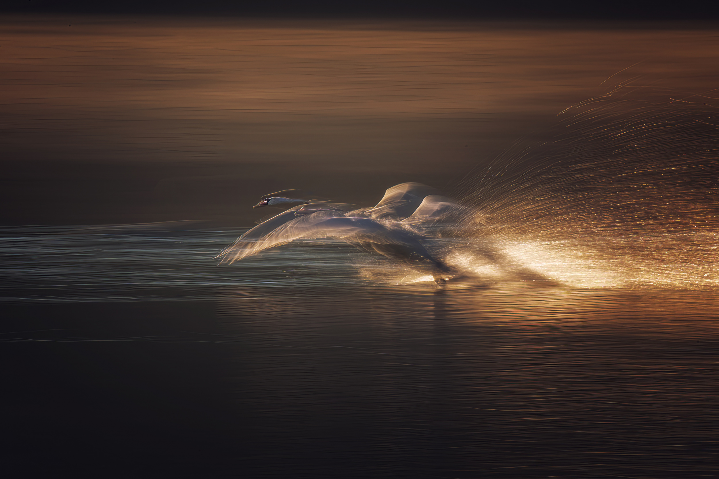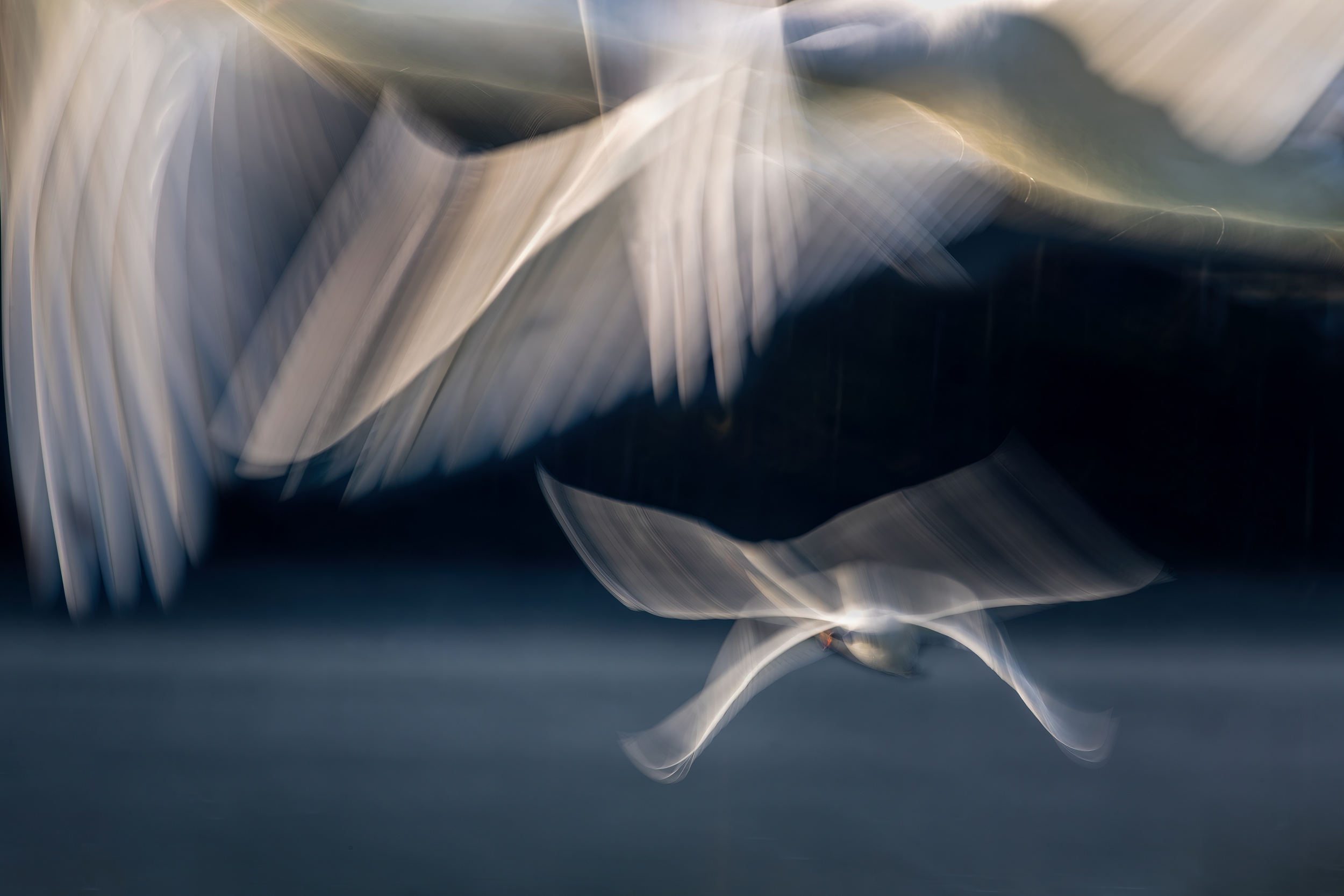 For the photograph called Fly, because of the distant flights of the swans, I used two longer lenses 200-500mm and 150-600mm on a Nikon D5, where the setting was multiple, sequence of two shots, average merging, speed 1/20 sec f 11 ISO 64 and on the second Nikon D850 1/1000 sec f 5.6 ISO 1600. Focusing autofocus spot focal length 390mm on both. Shutter released in series.