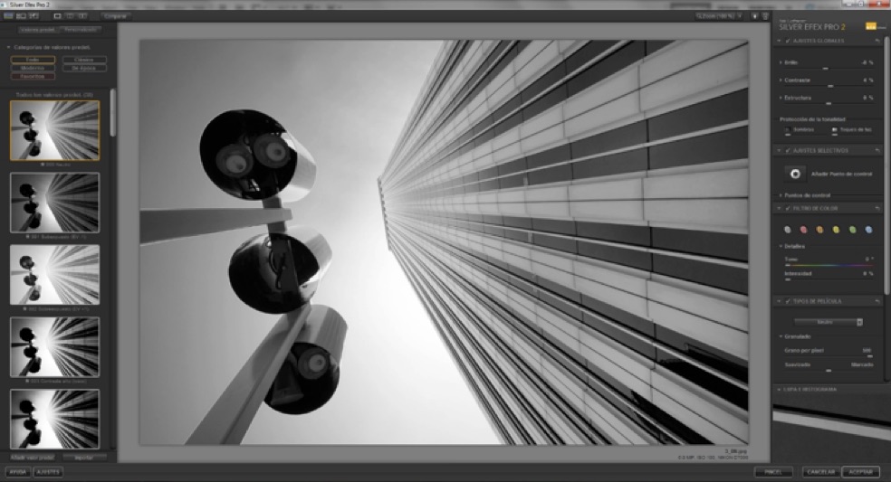 2) In Photoshop, I opened the image in Nik Silver Efex Pro 2 plugin. I usually apply the first two presets: 000 Neutral and 001 Underexposed (EV –1). In this case, I used the Neutral preset and then under Global Adjustments, I decreased Brightness (–8) and increased Contrast (+4). It is very important to add Control Points: I tend to use a total of 9 points (3 at the top of the photo, 3 in the middle and 3 at the bottom). It's also very important to increase the Brightness and the Contrast in those Control Points using values between +10 and +30, but do not adjust the Structure settings at this stage because it might spoil the final result.
